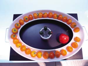 橢圓的陶瓷外形盤端坐在木質(zhì)托盤上,極具莊重典雅的色彩,四周凹槽里緊挨的圣女果,象征著家庭團(tuán)團(tuán)圓圓,就沖這個寓意,你就不忍心放手啦。